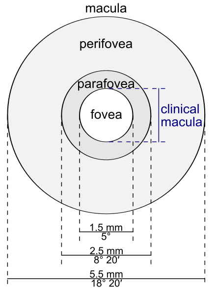 了解了这两种感光细胞依然没有解决我们今天的问题,那么我接着再讲一个概念“中央凹”。在眼球的中间位置,有这么一个地方,几乎没有血管,视网膜最薄,视锥细胞在这里高度密集……这里就是”中央凹“。