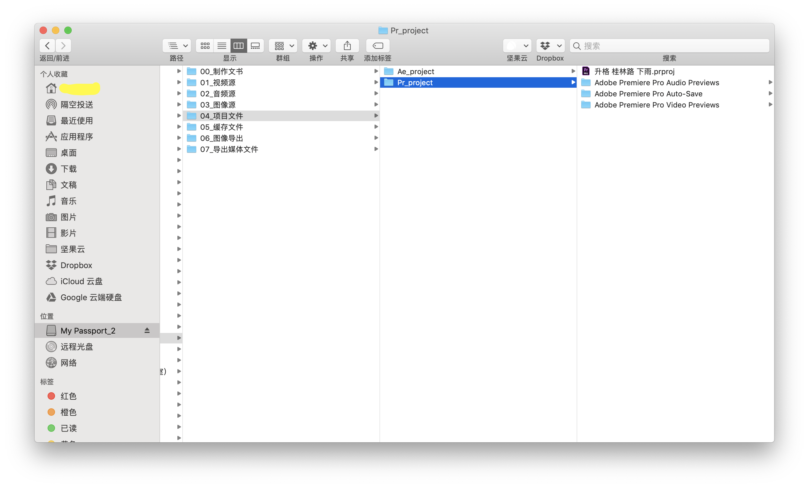 可以看到,按照之前介绍的文件管理方式,要想云端备份Adobe家的工程文件只能备份“04_项目文件”这个文件夹。而到坚果云里再建立一个XXXX工程文件备份的文件夹把““04_项目文件”放进去,以区分多个项目,不然难以区分。