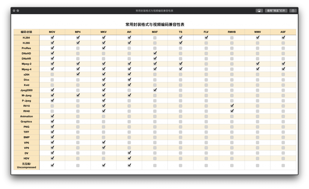 视频常用封装格式与编码兼容性表 内容如题 tshaveanideaNovember 15, 2019Film 为了方便后期制作和交付,这里从天工学堂摘了这一部分的内容,正如题——常用封装格式与视频编码兼容性表。 文章最后附有Numbers表格下载(Windows和Android用户对不起啦 Numbers导出Excel格式有些不兼容 而Numbers的文件一般来说你们打不开 所以还是看看图片吧)。 对了,转码封装推荐使用ffmepg,一款命令行软件,或者可以在Mac OS上使用它的GUI版本ff·works(第三方开发 收费),Windows请自行搜索。 点击后可查看/下载原图 Numbers表格下载 未来可能讲讲导出交付这些事?比如该用什么编码,用什么格式封装,什么动态码率,什么分辨率,什么色彩空间之类的一大串内容。也有可能也不讲,先鸽🐦着再见 Share this:TwitterTelegramEmailLike this:Like Loading... tshaveanidea ts, tssblog's owner, a.k.a. Lucas Articles: 86 Previous Post 大学生的你真的需要一张双币信用卡 Next Post 对于色彩科学和色彩管理的巨大疑惑和一点认知
